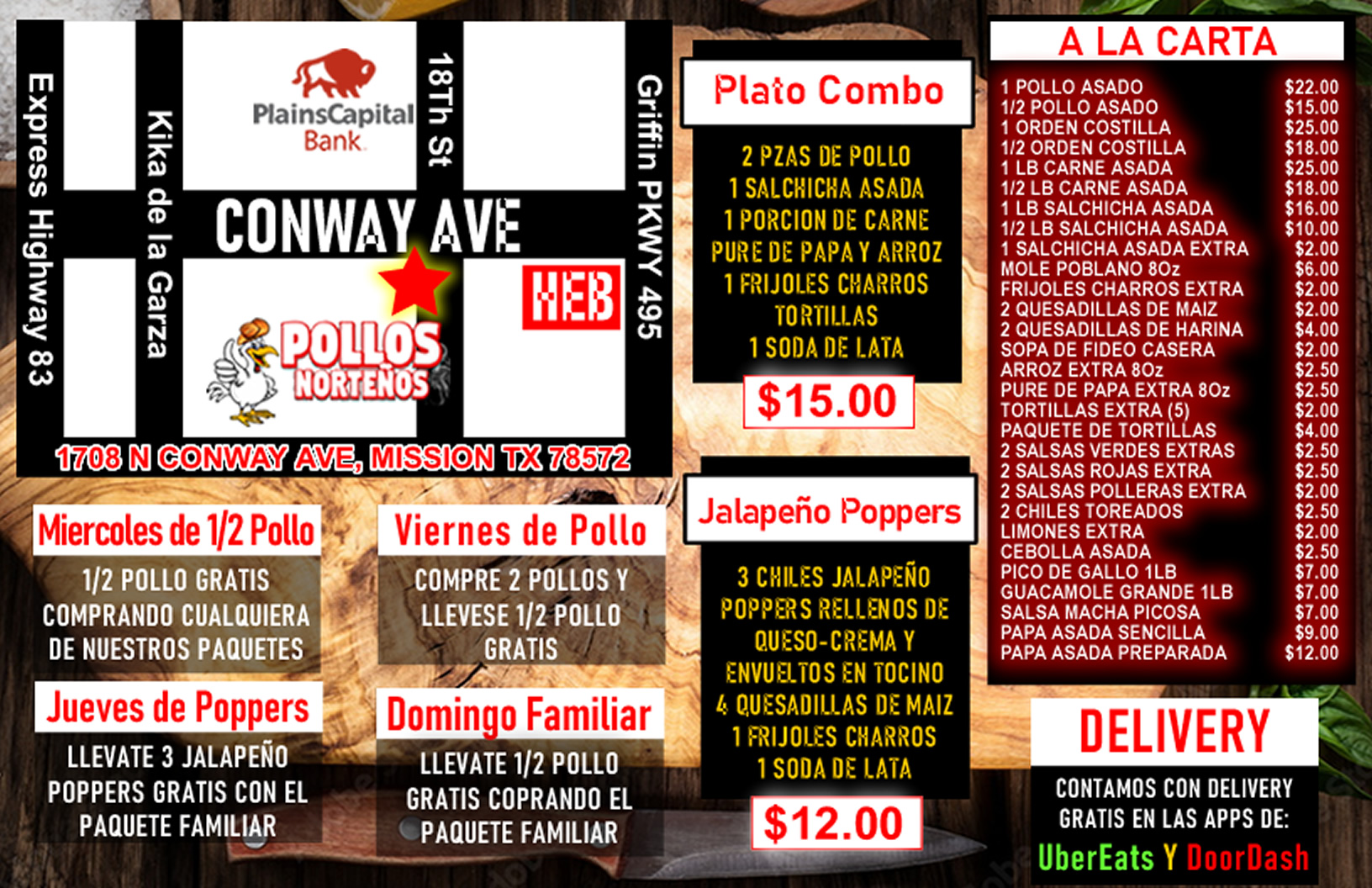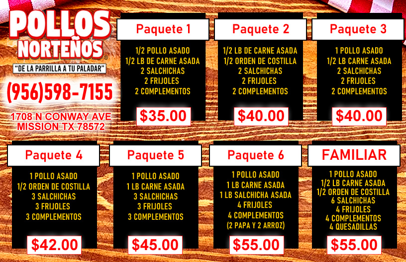 Pollos Norteños, es un Restaurante familiar solo para llevar, que conserva el rico sabor que ha pasado de generacion en generacion por medio de recetas unicas en cuanto a sabor se refiere. Nos encontramos en la ciudad de Mission, Texas y contamos con clientes en todo el Valle de Texas. Nuestro sabor es digno de presuncion.